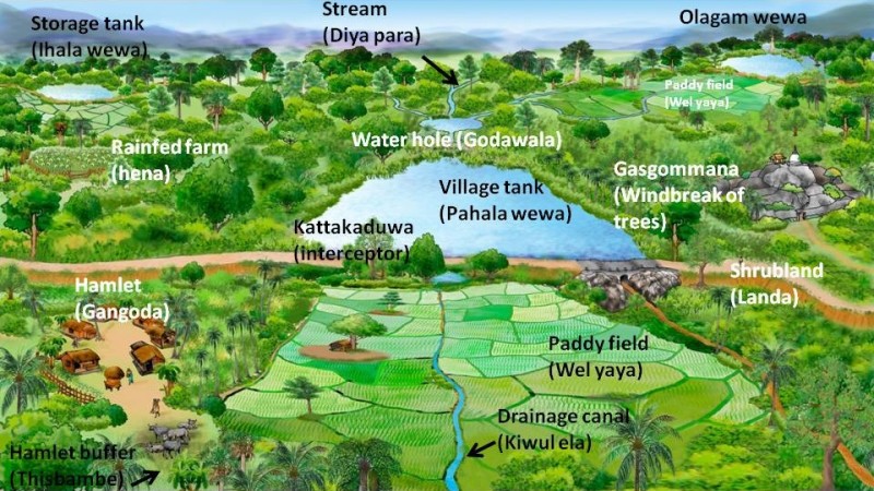 Interceptor (Kattakaduwa ): The stretch between the tank bund and paddy fields consisting of three land phases (water hole, marshy land and dry upland). Acts as a downstream wind barrier, reduces tank seepage, prevents sodium, magnesium and iron from entering the paddy land and safeguards the tank bund. It is also a common village garden and agro-forestry system providing medicines, fuel wood, timber, fencing materials, farm and household materials, fruit, vegetables and fodder, as well as raw materials for cottage industries.