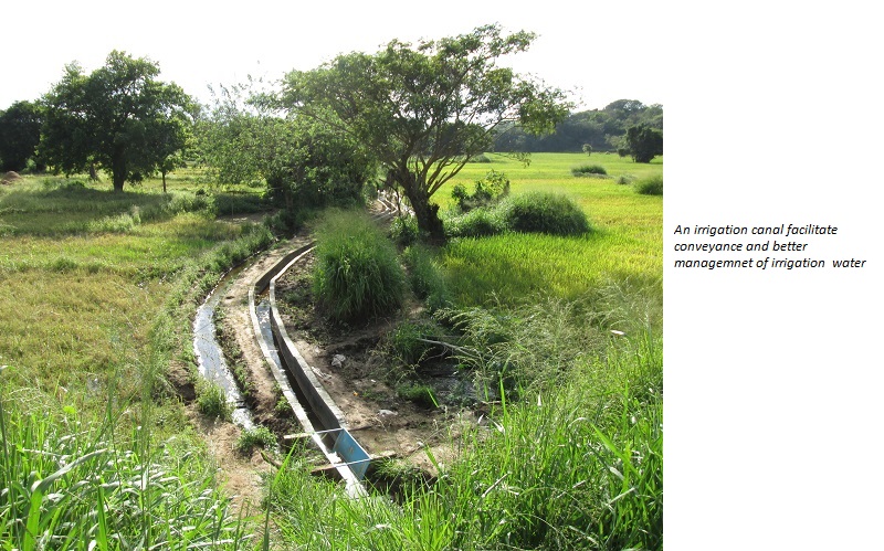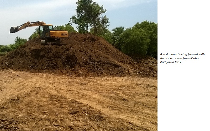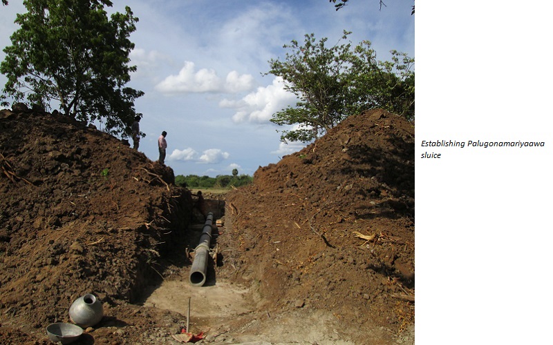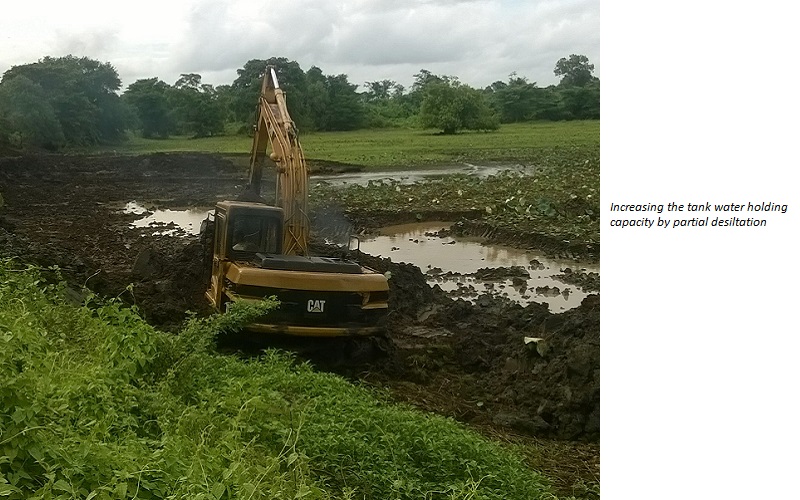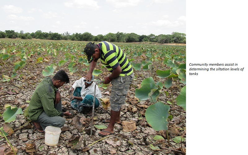 | Conduct preliminary investigations in 21 tanks, tank bed surveys in 18 tanks, and sediment depth surveys in 6 tanks to identify rehabilitation needs and developing restoration plans Rehabilitation work (of tank bunds, sluices, spills, irrigation canals, water distribution structures, etc.) completed in 18 tanks in the Kapiriggama cascade Tank water holding capacity increased effectively by removing 38,000 m3 of silt from 5 tanks | 2,500 farmers from 11 villages received improved irrigation water availability for cultivating in both seasons, where previously it was possible for a lesser extent in the cascade. The potential cropping intensity of the cascade is increased from 0.8 to 1.5 (where the general maximum is 2.0) These interventions further enhances year around water availability for cultivation, domestic use, and ecosystem services |